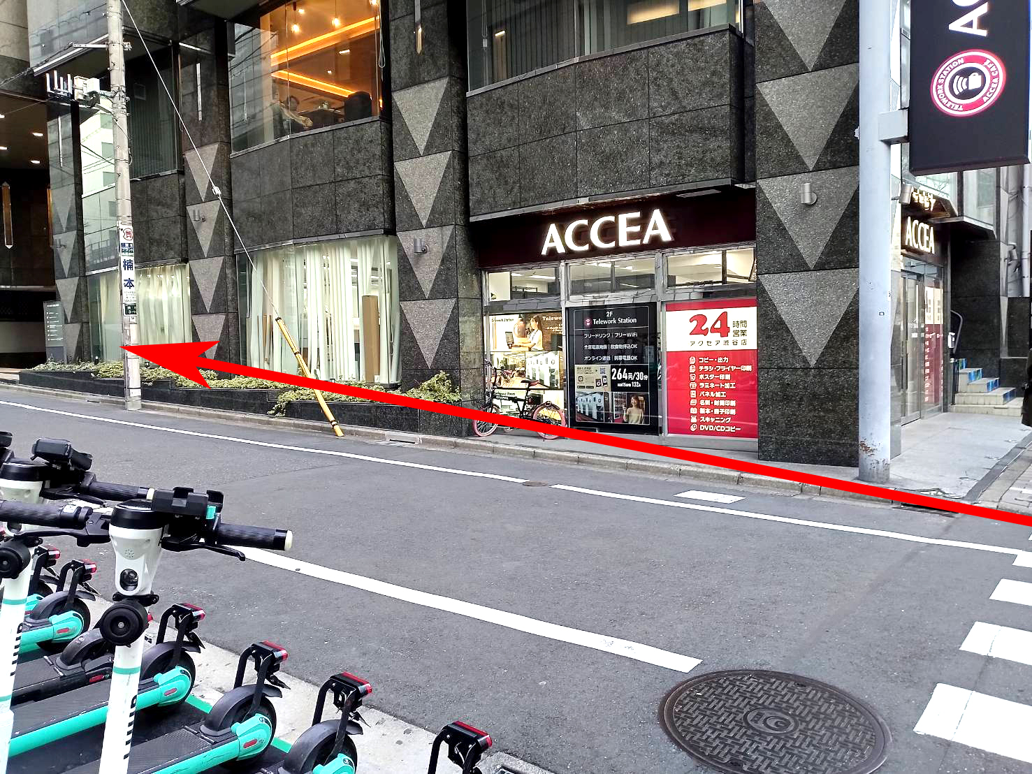 階段を下りたら、渋谷警察署前、ローソン、Tomods(薬局が左側にある歩道(明治通り)を直進します。